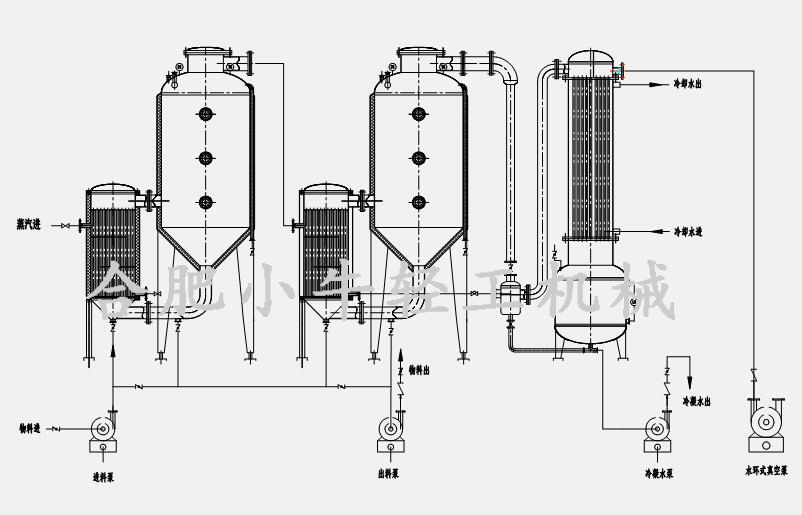 雙效外循環(huán)蒸發(fā)器(雙效濃縮器)主要由各效加熱器、各效分離器、冷凝器、冷凝液罐、真空泵、料液泵、閥門管路系統(tǒng)、電控系統(tǒng)組成。設(shè)備在運(yùn)行時(shí),料液進(jìn)入分離器及加熱器的管程,鍋爐蒸汽進(jìn)入一效加熱器的殼程,料液在真空狀態(tài)下沸點(diǎn)降低,當(dāng)受熱到一定溫度后沸騰,并從噴射管噴入分離器,進(jìn)行快速蒸發(fā)和汽液分離,未被蒸發(fā)的料液從底部循環(huán)管回流到加熱器再次噴入分離器,形成循環(huán)。由一效加熱器產(chǎn)生的二次蒸汽進(jìn)入二效加熱器作為加熱介質(zhì),得到熱能充分利用,從而實(shí)現(xiàn)節(jié)能效果。二效蒸發(fā)器內(nèi)的物料運(yùn)動(dòng)狀態(tài)與一效同理,當(dāng)料液縮到一定的程度,經(jīng)取樣確定合格后即可出料。而產(chǎn)生的二次蒸汽進(jìn)入冷凝器殼程,被管程內(nèi)的冷卻循環(huán)水換熱冷凝成液相,進(jìn)入冷凝水收集罐,最后排出。