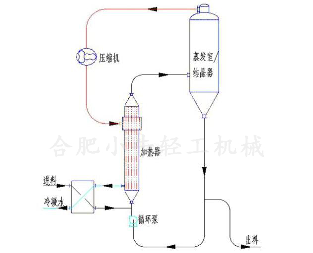 物料在加熱器的管程內(nèi)被殼程的蒸汽加熱溫度升高,在循環(huán)泵作用下物料上升到分離器中,在分離器內(nèi)由于物料靜壓下降使物料發(fā)生蒸發(fā)。蒸發(fā)產(chǎn)生二次蒸汽從物料中溢出,物料被濃縮產(chǎn)生過飽和而使結(jié)晶生長(zhǎng),解除過飽和的物料進(jìn)入強(qiáng)制循環(huán)泵,在循環(huán)泵作用下進(jìn)入加熱器,物料如此循環(huán)不斷蒸發(fā)濃縮或濃縮結(jié)晶。晶漿從循環(huán)管路中用出料泵輸出。蒸發(fā)分離器內(nèi)的二次蒸汽經(jīng)過蒸發(fā)分離器上部的分離和除沫裝置凈化后輸送到壓縮機(jī),壓縮機(jī)把二次蒸汽壓縮后輸送到加熱器殼程用作蒸發(fā)器加熱蒸汽,實(shí)現(xiàn)熱能循環(huán)連續(xù)蒸發(fā)。